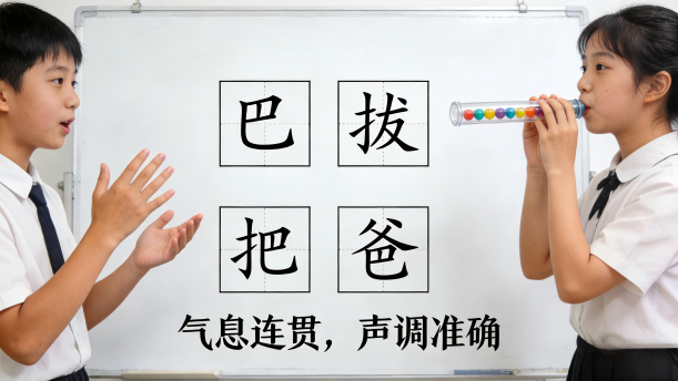 在练习四字词的时候,结合口腔控制、呼吸控制、喉部控制、共鸣控制同时练习。