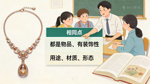 第二十五课 三、即兴口语——聚敛思维 (一)同异并用法 同异并用法是求同法和求异法的联合运用。 (二)学生乐园 1.说一说"项链和书"的相同和不同之处,最后得出结论。 2.说一说"桌子和笔...
