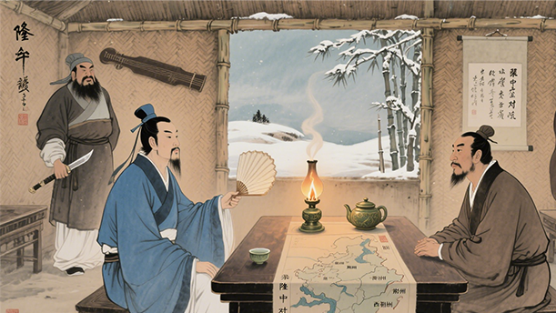 诸葛亮分析了群雄纷争的形势,提出了三分天下、最后取胜的策略。刘备听了茅塞顿开,像拨开云雾见到了青天。