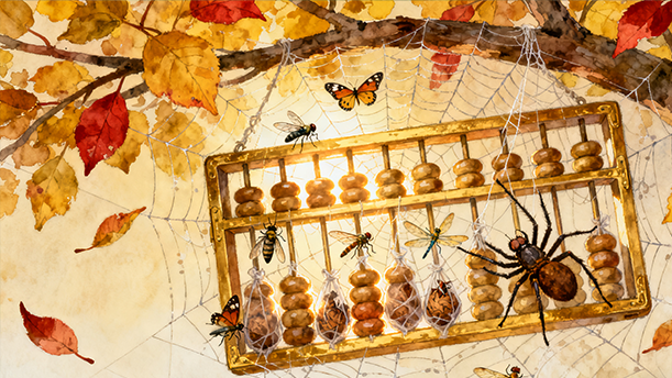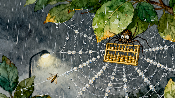 老蜘蛛爬爬先生有个金算盘,他能算出织一张网需要用多少线。爬爬织的网既经济又结实,森林里所有的动物都说爬爬是个能干的蜘蛛。