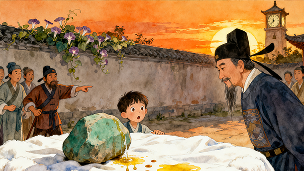 话说宋朝的时候,有一个小孩,他靠卖油条为生。一天,小孩卖完油条,坐在路边的一块石头上,用油乎乎的手数着铜钱,刚好一百个。因为太累了,小孩靠在石头上睡着了。等他醒来,却发现铜钱不见了,于是坐在地上大哭。