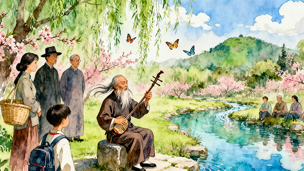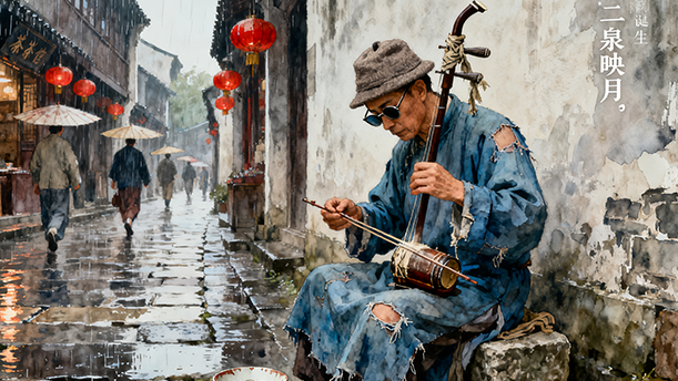 自然界的声音给了阿炳无限灵感,他的技艺越来越精湛。他的感情,他的希望,他的理想,流荡在他的十指间,流荡在他的琴弦上,流荡在人们的心坎里。人们听着听着,有的沉思,有的叹息,有的流泪,有的唏嘘……