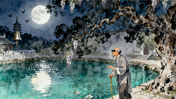 因为眼疾,阿炳被迫离开了道观,在街头流浪,靠拉二胡讨饭度日。夏天的夜里,他冒着露水,坐在田野上谛听着鸟叫,谛听着蛙鸣,他在沉思;秋天的夜里,在清冷的月光下,他穿着单薄褴褛的衣衫,站在龙光塔边,远远地谛听着那久已不许他接近的“二泉”的流水声,他在沉思……