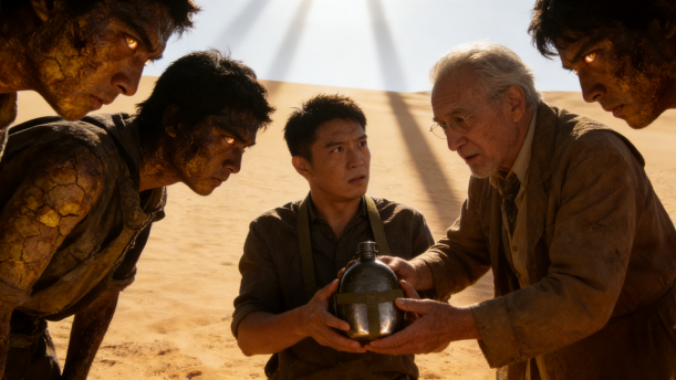 半个月前,我们跟随肇教授沿着丝绸之路进行风俗民情考察。可是在七天前,谁也不知道怎么会迷了路,继而又走进眼前这片杳无人烟的沙漠。干燥炎热的沙漠消耗了我们每个人的体力。食物已经没有了。最可怕的是干渴。谁都知道,在沙漠上没有水,就等于死亡。迷路前,我们每人都有一壶水;迷路后,为了节省水,肇教授把大家的水壶集中起来,统一分配。可昨天夜里,肇教授死了。临死前,他把挂在脖子上的最后一个水壶给我说:“你们走出沙漠全靠它了,不到万不得已时,千万......千万别动它。坚持着,一定要走出沙漠。”