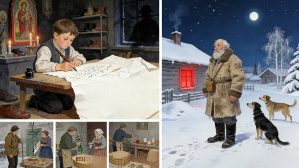 九岁的凡卡·茹科夫,三个月前给送到鞋匠阿里亚希涅那儿做学徒。圣诞节前夜,他没躺下睡觉。等老板、老板娘和几个伙计到教堂做礼拜去了,就从老板的立柜里拿出一小瓶墨水,一支笔尖生了锈的钢笔,摩平一张揉皱了的白纸,写起信来。