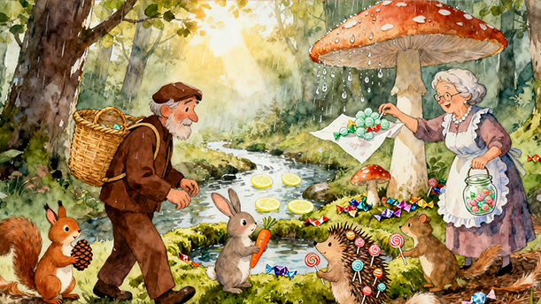 有一天,他们吵架了,糖果奶奶气极了,转身离开了小屋子!她开始哭起来,但是呀,她不能哭得太厉害,不然她的糖果面频就会融化掉!