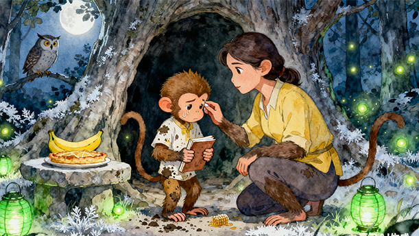 猴弟弟把刚才见到的事情告诉了妈妈。妈妈说:“你不应该独自出去玩儿,但是你虚心好学,长了不少知识,这是很好的。”