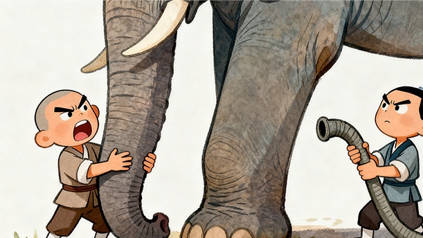 摸到象牙的人驳斥说:“哪里,大象像一根大萝卜!”