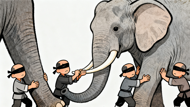 过了好一会儿,他们都摸得差不多了。国王问道:“现在你们明白大象是什么样子的了吗?”瞎子们齐声回答:“明白了!”国王说:“那你们都说说看。”