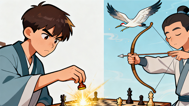 另一个学下棋的青年人则不同,每次当奕秋讲棋的时候,他虽然也坐在那里听,可是思想却开了小差,总觉得有大天鹅快要飞过来了,待天鹅快要飞到眼前时该要准备好弓和箭了。他一心想着当天鹅飞近后该如何拿弓,如何搭箭,又要如何瞄准,然后再怎样放箭,向最大的天鹅射去,等等。