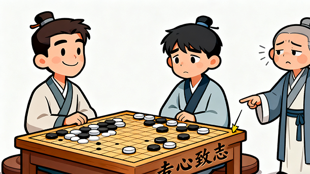 有两个青年人想学下棋。他们听说奕秋是全国最有名的棋手,就相约一起来到奕秋这里,拜奕秋为师学下棋。
