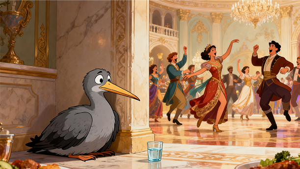 海鸟看到这莫名其妙的场面,被吓得有些发呆。它离开了辽阔的大海,失去了宝贵的自由,看着面前纷乱的人世,只觉得头昏眼花,充满了惊恐和悲伤。海鸟始终不敢吃一块肉,不敢饮一杯酒。三天之后,它便在极度的惊吓、忧郁中死去了。
