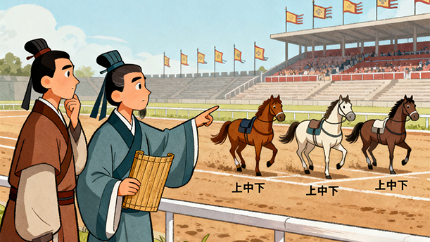 齐国的将军田忌经常同齐威王赛马。他们赛马的规矩是:双方各下赌注,比赛共设三局,两胜以上为赢家。然而每次比赛,田忌总是输家。