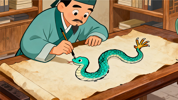 这件事很快就在门客们中间传开了,大家都觉得那个给蛇画脚的人实在太可笑了。明明已经最先画完蛇,赢得了喝酒的机会,却因为多此一举地给蛇添脚,而失去了那壶美酒。从此以后,每当有人想要做些不必要、反而会坏事的事情时,大家就会用“画蛇添足”这个成语来提醒他,做事要适可而止,不可多此一举,否则可能会像那个给蛇画脚的人一样,失去原本到手的好处。而这个成语,也一直流传了下来,成为了一个警示后人的经典故事。
