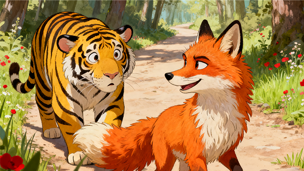 而狐狸呢,它心里清楚得很,这一切不过是自己编造的谎言罢了。但它却享受着这种被“百兽敬仰”的感觉,走起路来更加趾高气扬,仿佛自己真的成了这片森林的主宰。它偶尔回头,用那双狡黠的眼睛瞥向老虎,嘴角挂着一丝不易察觉的微笑,似乎在得意于自己的聪明才智。