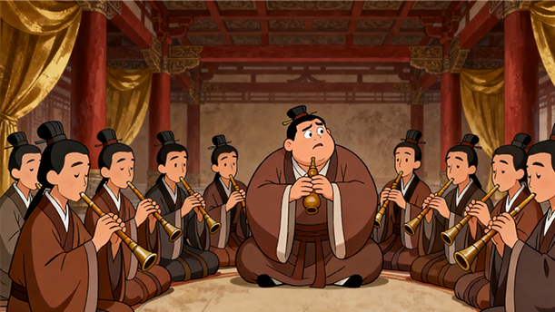 古时候,齐国的国君齐宣王爱好音乐,尤其喜欢听吹竽,手下有三百个善于吹竽的乐师。齐宣王喜欢热闹,爱摆排场,总想在人前显示做国君的威严,所以每次听吹竽的时候,总是叫这三百个人在一起合奏给他听。
