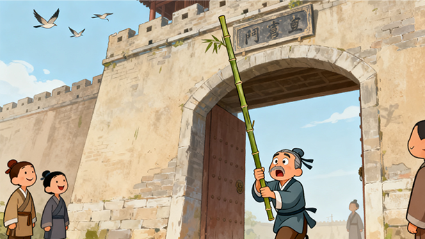 鲁国有个人扛着根又粗又长的毛竹进城。到了城门口,他把毛竹竖起来拿,被城门卡住了;他把毛竹横着拿,又被两边的城墙卡住了。