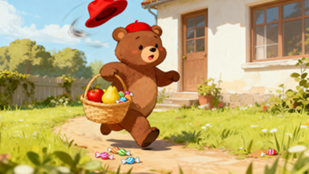 小熊连忙放下手中的竹篮儿,去捡帽子。等他捡起帽子往回走的时候,忽然看见了地上的竹篮儿,里面还装着苹果、鸭梨、牛奶糖呢!