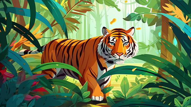 在茂密的森林里,有一只老虎正在寻找食物。一只狐狸从老虎身边窜过。老虎扑过去,把狐狸逮住了。