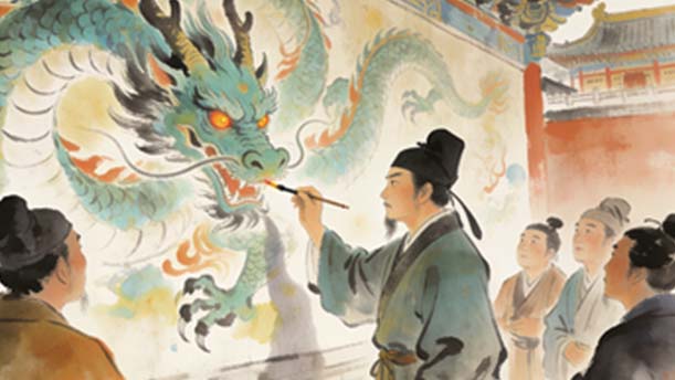 南北朝时期的梁朝有位很出名的大画家,叫张僧繇,他的绘画技术很高超,当时的皇帝梁武帝信奉佛教,修建的很多寺庙,都让他去作画。有一年,梁武帝要张僧繇为金陵的安乐寺作画,在寺庙的墙壁上画四条金龙。他答应下来,仅用三天时间就画好了这些龙画得栩栩如生,惟妙惟肖,简直就像真龙一样,活灵活现。
