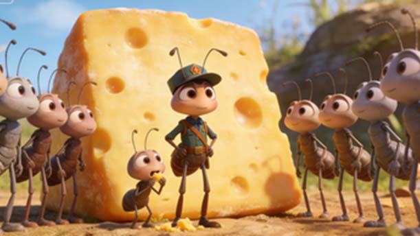 小蚂蚁们从四面八方的草丛里走拢来了。当他们重新聚到奶酪旁边时,蚂蚁队长命令年龄最小的一只蚂蚁:“这点儿奶酪渣是刚才弄掉的,丢了可惜,你吃掉它吧!