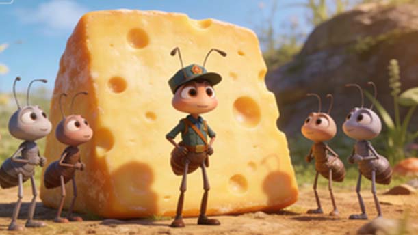 就在这时,蚂蚁队长发现了一块大奶酪。那块奶酪实在太大了,他左抬抬不起,右搬搬不动,只好叫来七八只小蚂蚁当助手。