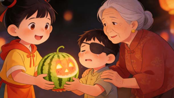 这时,一阵哭声传来。我停住脚步,仔细地找。只见不远处一个老奶奶搂着一个小男孩,“娃娃乖,不哭,不哭”。可是孩子还是不停地哭。我和灯孩儿走到他们跟前,发现小男孩手中一盏灯都没有。灯孩儿拍拍手,神奇地变出了一盏亮亮的西瓜灯。“给你别哭了。”谁知小男孩哭得更厉害了。老奶奶伤心地说:“他,他什么也看不见。”灯孩儿又伤心又着急,他把手搓热蒙在男孩眼睛上暖着,又用嘴里的热气哈着男孩的双眼。可是男孩依然什么也看不见。