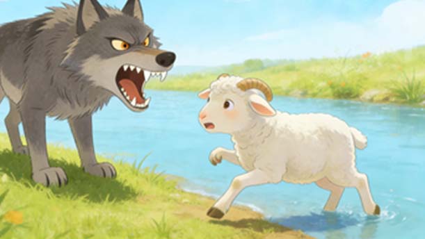 于是,狼大声呵斥道:“无耻的东西,你竟敢用肮脏的嘴脸把泥沙搅混,弄脏了我这里的清水。为了惩罚你如此的胆大妄为,我要把你的脑袋拧下来!”