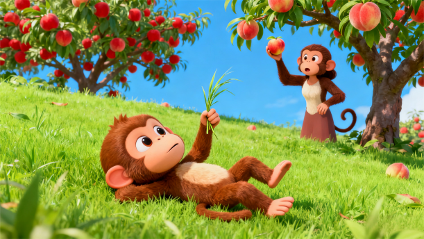 “小猴,快给弟弟摘个桃儿。”猴妈妈喊道。
