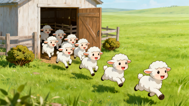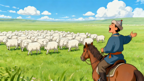 一只只羊儿涌出了圈门,蹦跳着奔向无边的草原。牧民们跨上骏马,追赶那欢乐的羊群。