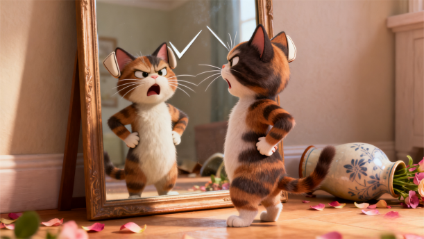 它皱着鼻子,皱着眉,心里直犯嘀咕,嘴里嘟囔着:“这镜子咋这么脏,把我俊模样都挡啦!”越想越气,胡子都气得翘起来,小爪子还不停地刨着地,模样真是又好气又好笑。