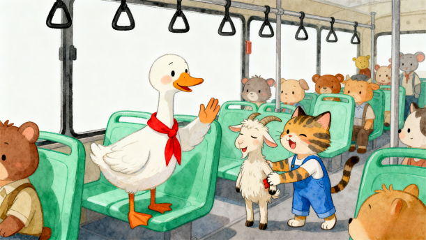 提 示:朗诵时,开篇“小山羊,乘公交”语调要轻快活泼,表现出日常轻松的氛围,把听众带入故事场景。“花白胡子胸前飘”这句要稍微放慢速度,用带有童趣的声音强调出小山羊的特征。