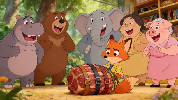 一天,小狐狸突然想出个主意。早晨,刚一开门,他又喊:“买腰带来买腰带,这里卖的是减肥腰带,不论您有多胖,只要您系上我的腰带,保您肚子变小,人变苗条,快来买减肥腰带呀!”