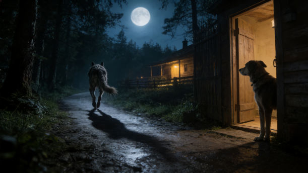 一条饥饿的瘦狼在月光下四处寻食,遇到了喂养得壮实的家狗。他们相互问候后,狼说:“朋友,你怎么这般肥壮,吃了些什么好东西啊?我现在日夜为生计奔波,苦苦地煎熬着。”