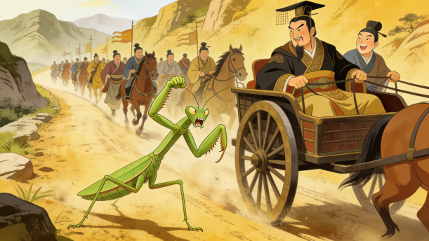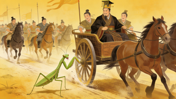 有一次,齐庄公带着几十名随从进山打猎。一路上,齐庄公兴致勃勃,与随从们谈笑风生,驾车驭马,好不轻松愉快。忽然,前面不远的车道上,有一个绿色的小东西,近前一看,原来是一只绿色的小昆虫。那小昆虫正奋力高举起它的两只前臂,怒气冲冲地挺直了身子直逼马车轮子,一副要与车轮搏斗的架势。