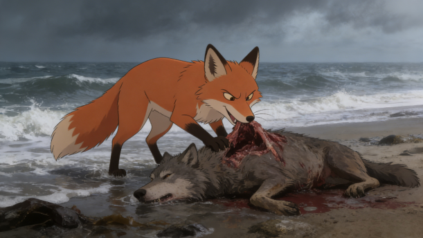 到了涨潮的时候,又把狼尸送到海岸来,狐狸抓着它,一边吃一边说:“愚人,是应该给狡猾者果腹的。”