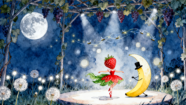 朗诵第1小节时,先用舒缓的语气把听众带入水果们在睡觉的宁静情境中,直到水果们醒来,语气变得欢快而充满期待感。