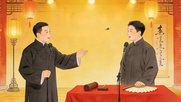 背景提示:单口相声、对口相声、群口相声的表演形式。