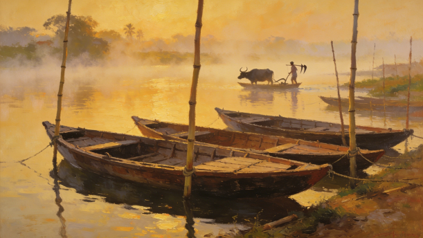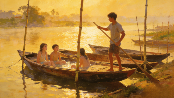 人们在早晨乘船渡过那边去,