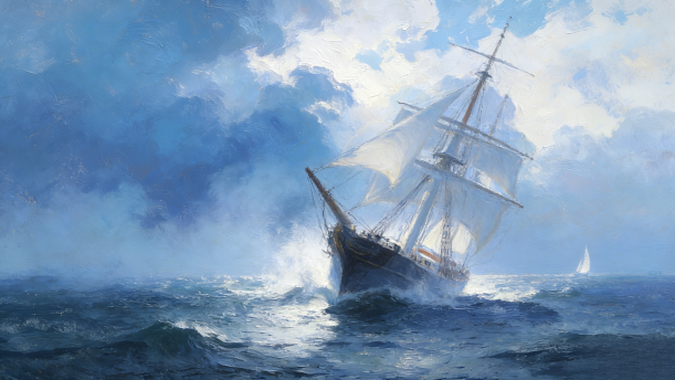 有一片孤帆儿在闪耀着白光......