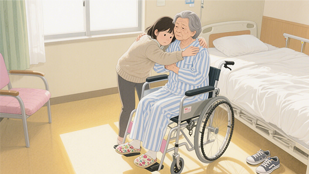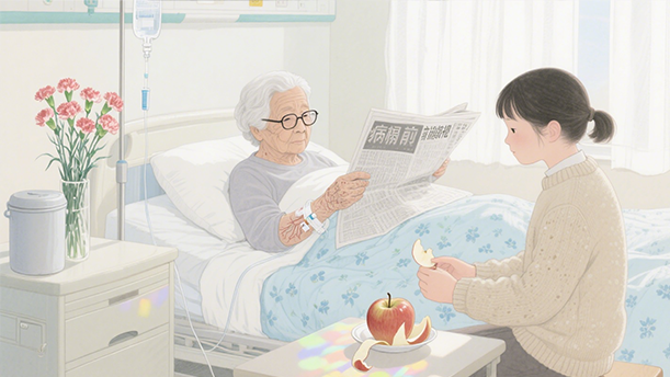 我坐在床沿上,把母亲抱在怀里,就像小时候母亲无数次抱我那样。为了让母亲容易入睡,我将她轻轻地摇动。护士不忍离去,母亲静静地站在边上看着。